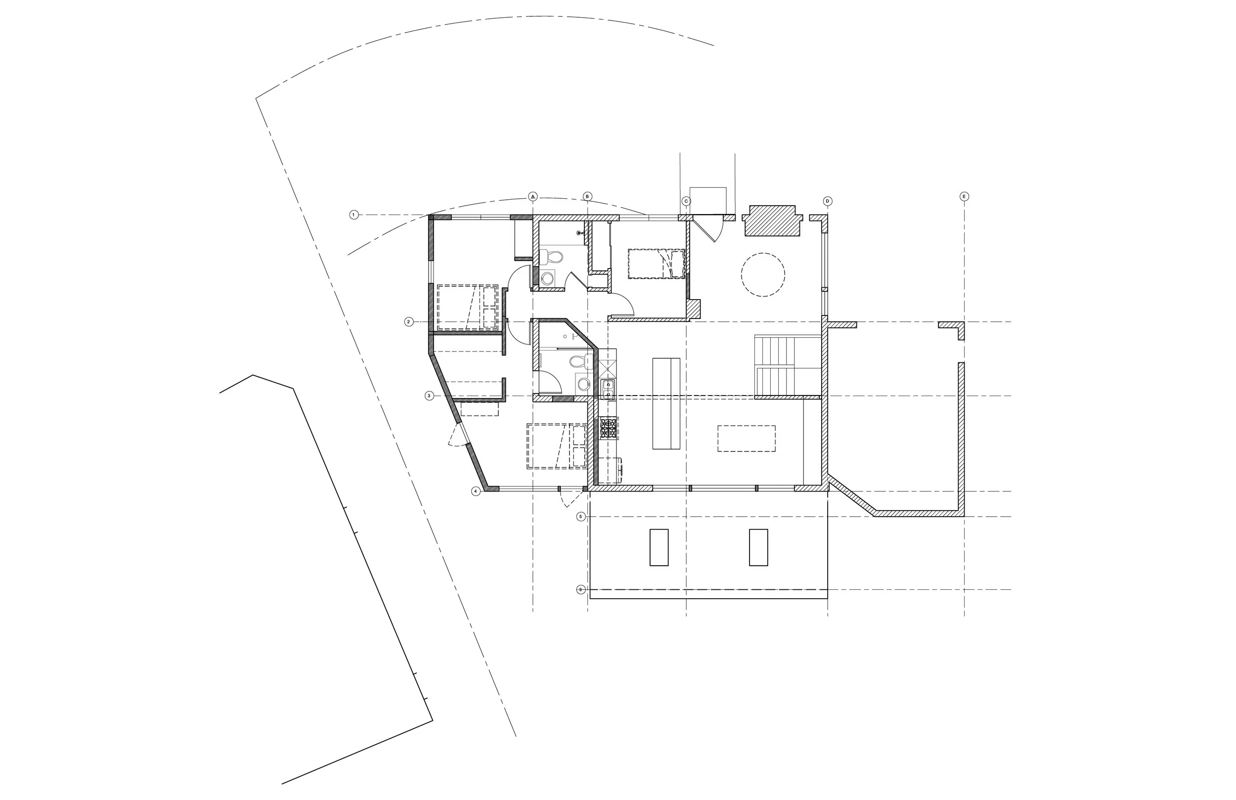 To accommodate a growing family in a "stuffy" lakefront log home, this addition pushes outward to capture the Northern Illinois shoreline. The new volume introduces social spaces and a parent suite that swap the original dark interior for expansive views of the water.